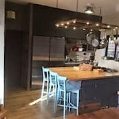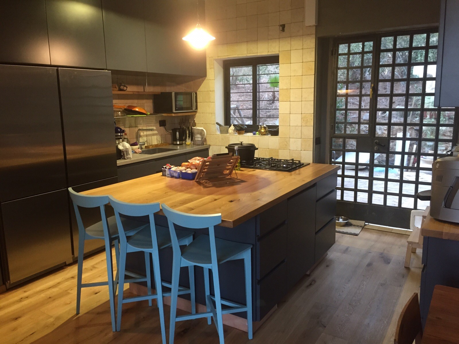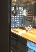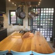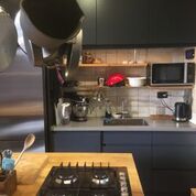 מטבח המשלב חזיתות בשלייפלק שחור עם ידית אינטגראלית, עם משטחי עץ מלא אלון מבוקע. האי הגדול שבמרכז החלל, משמש לבישול, לאפיה, לאיחסון ולאכילה.