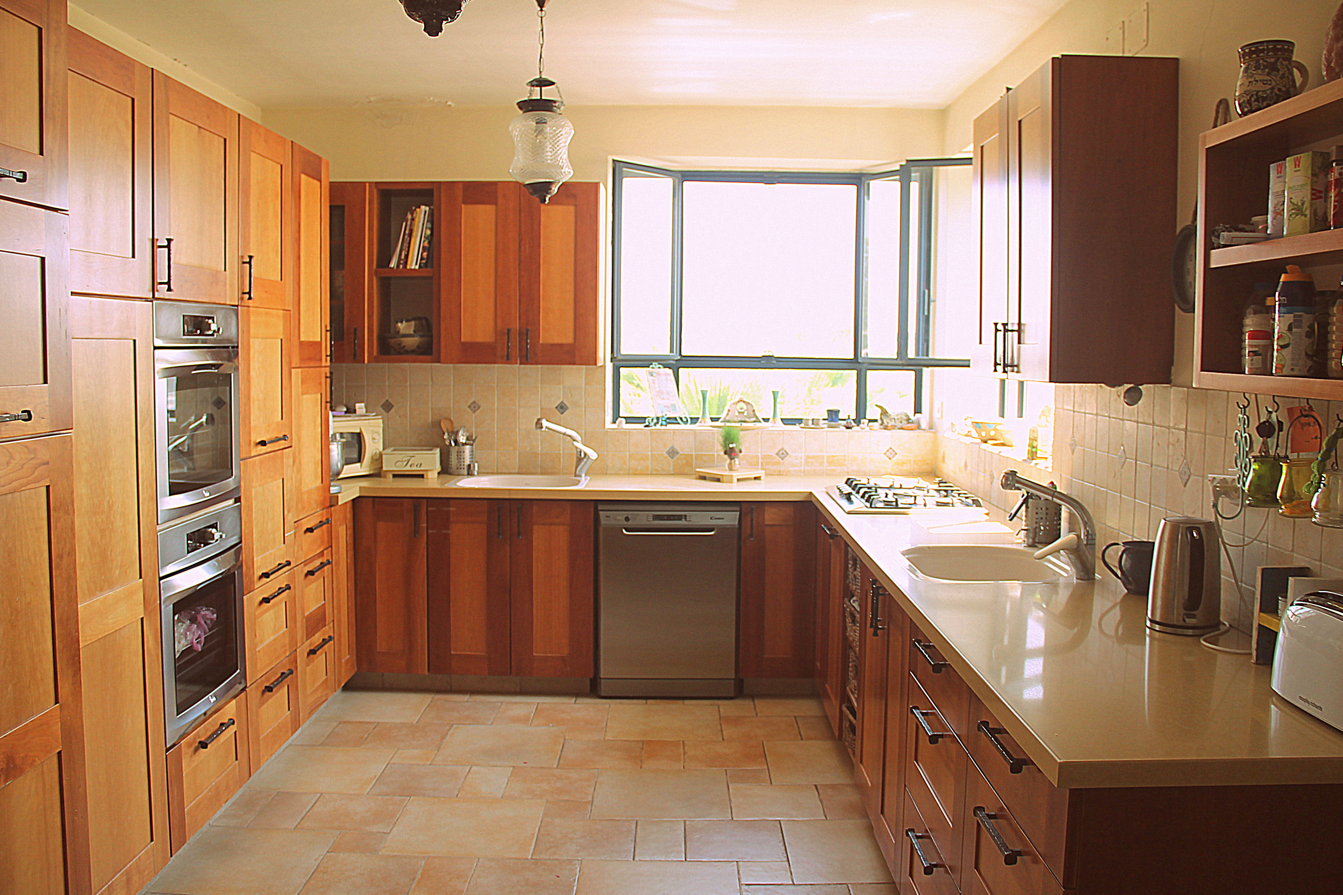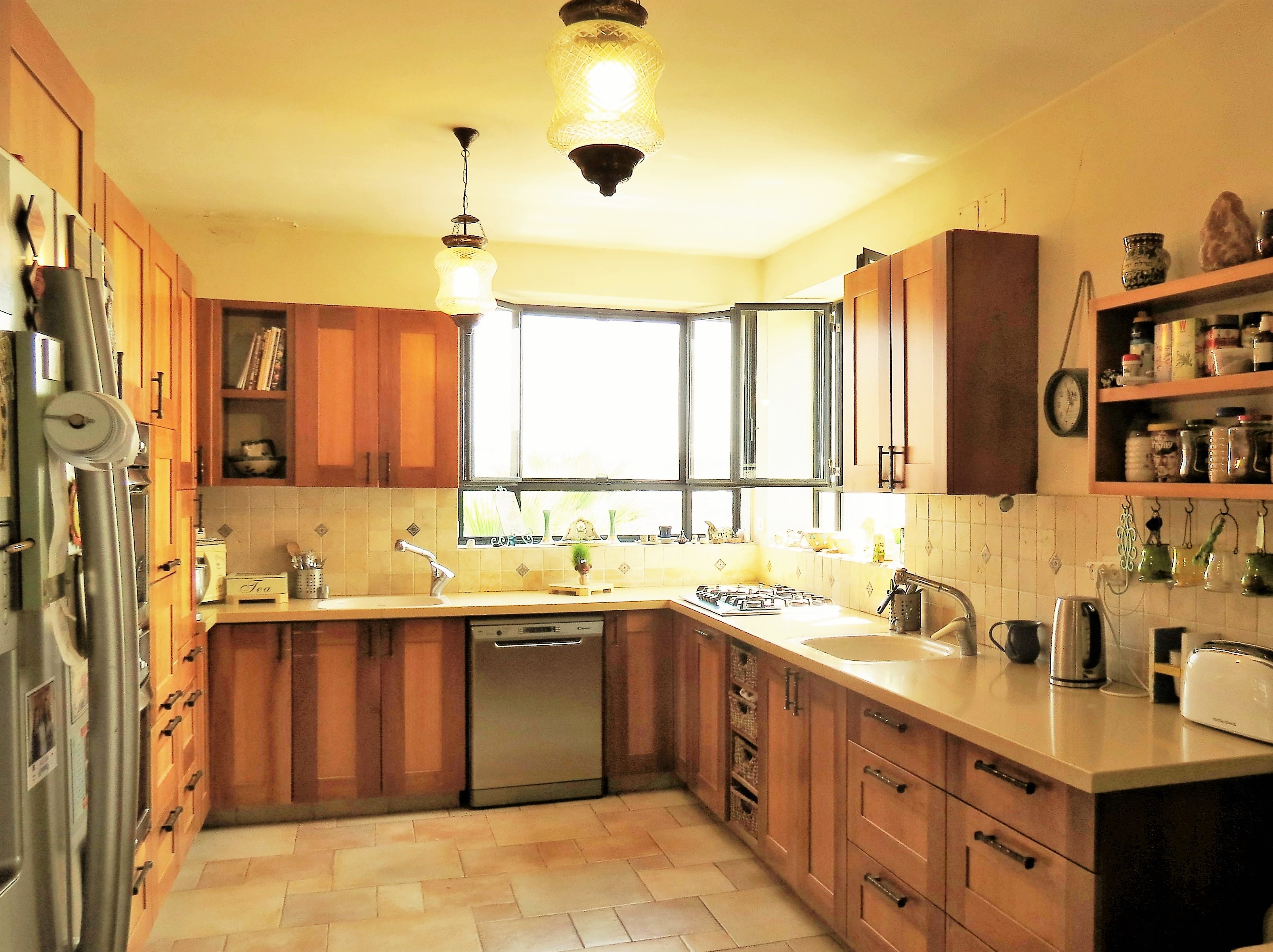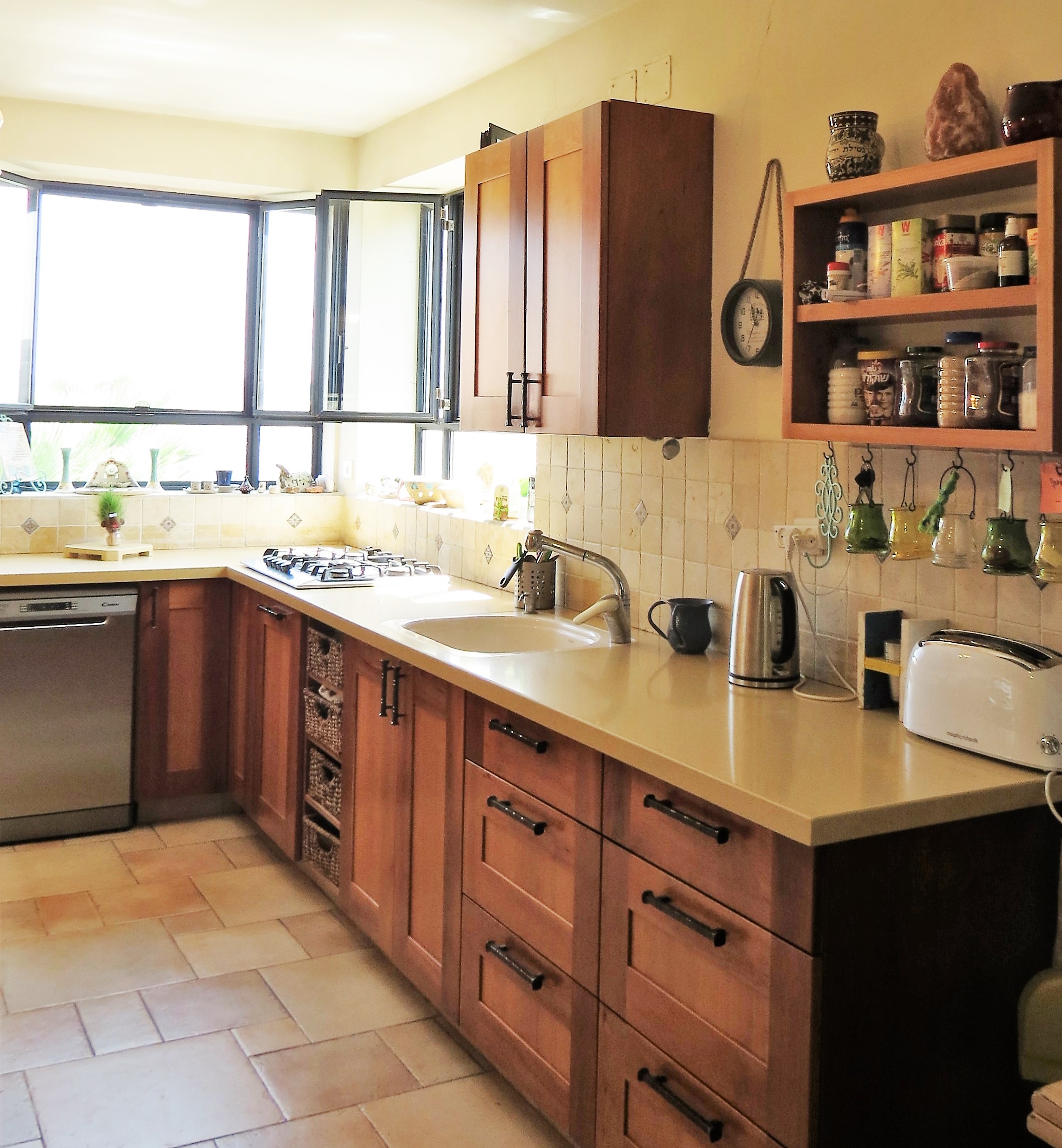 שילוב של מדפים פתוחים מאפשר גישה לספרי בישול, תבלינים וכד'
