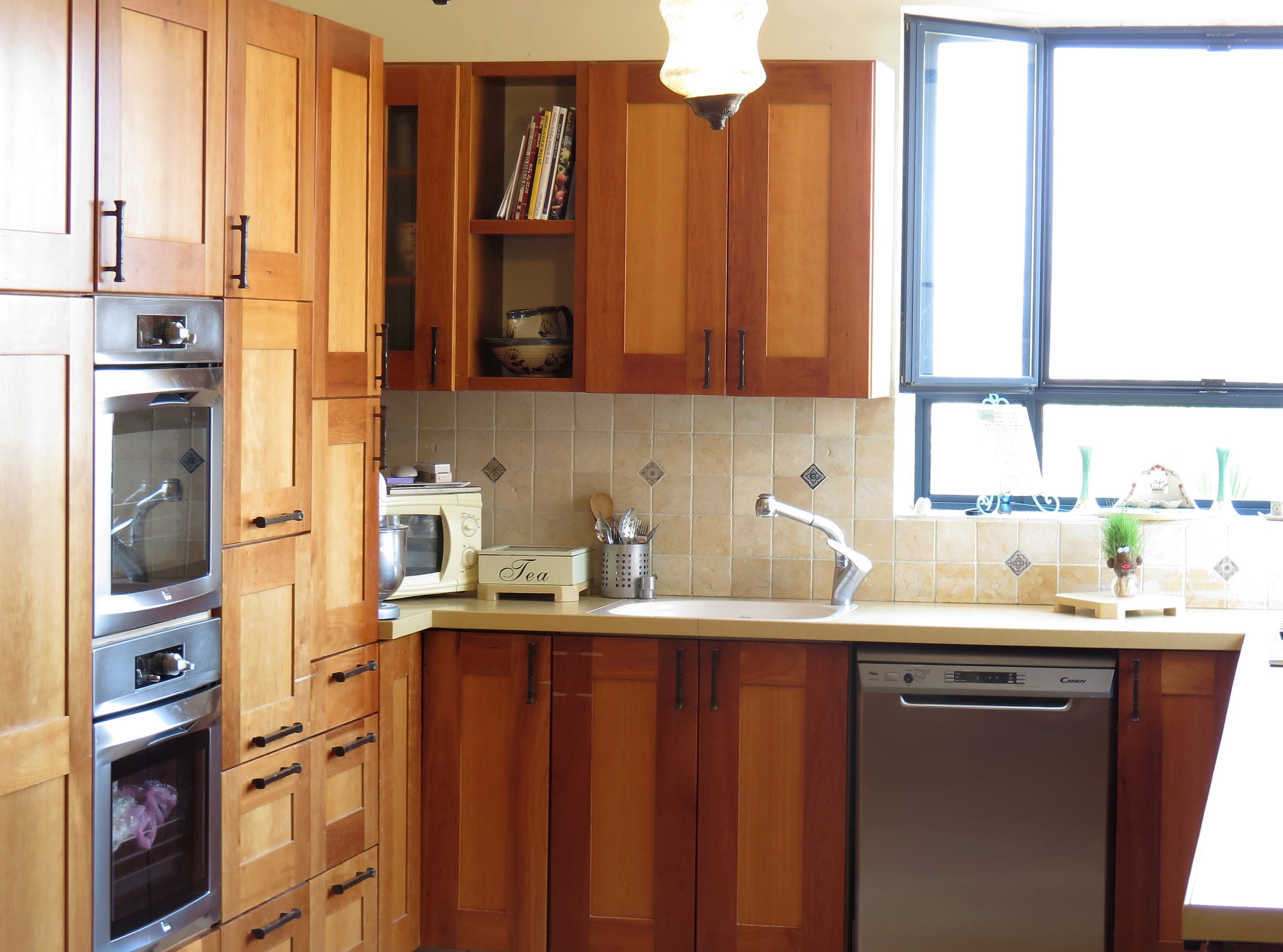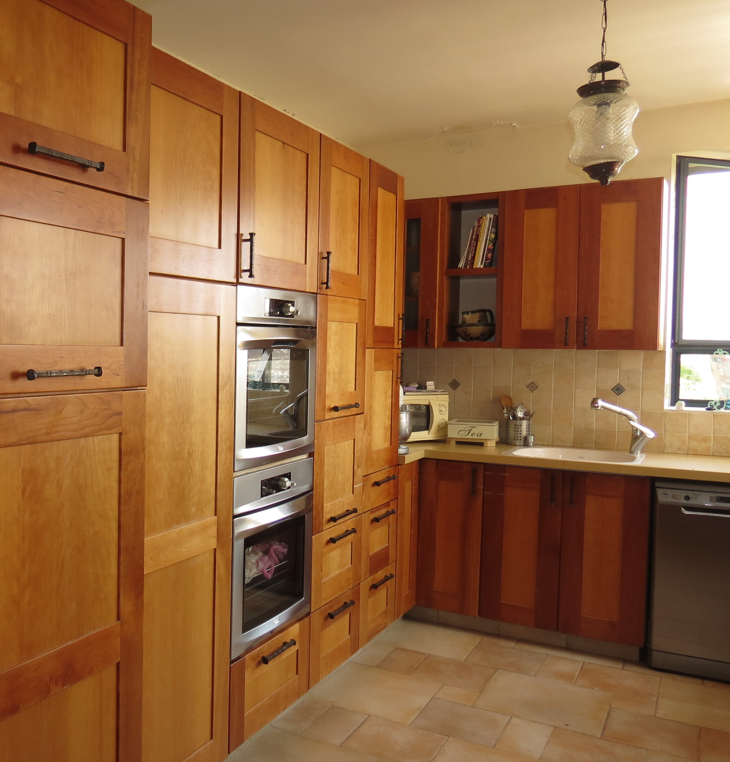 מטבח עץ מלא דובדבן עם חזיתות בעלות מסגרת רחבה.