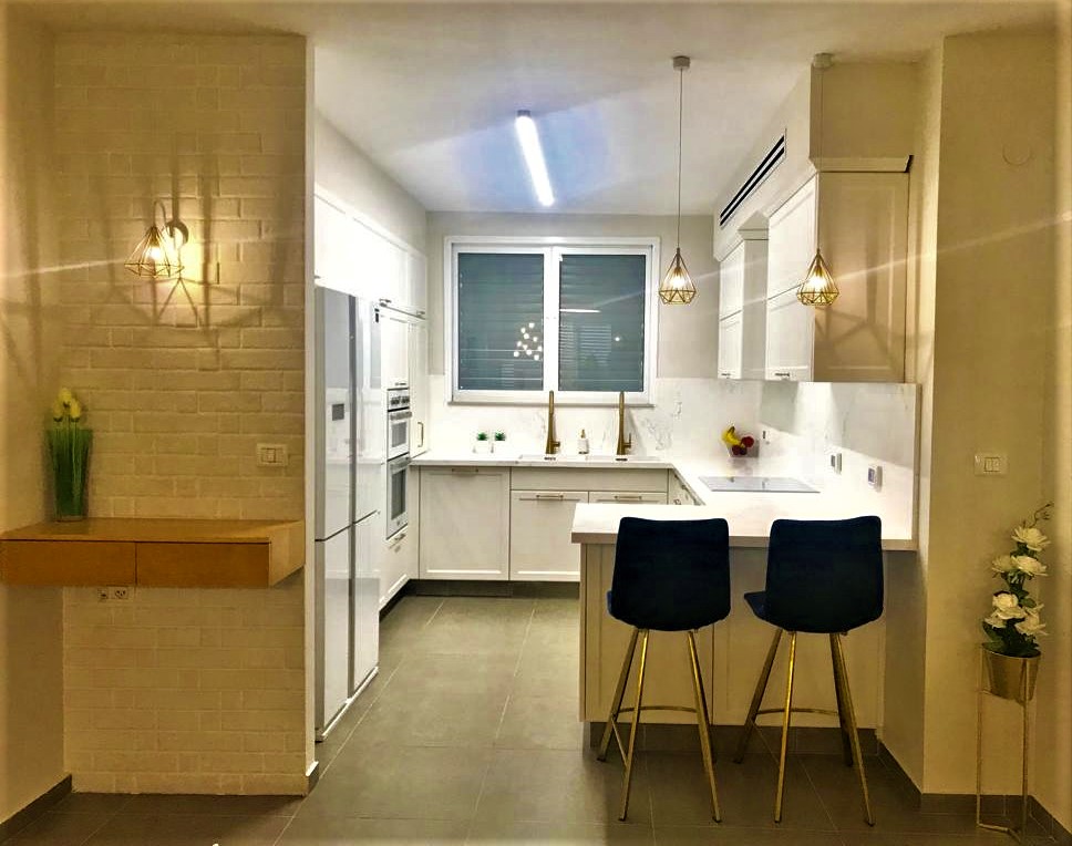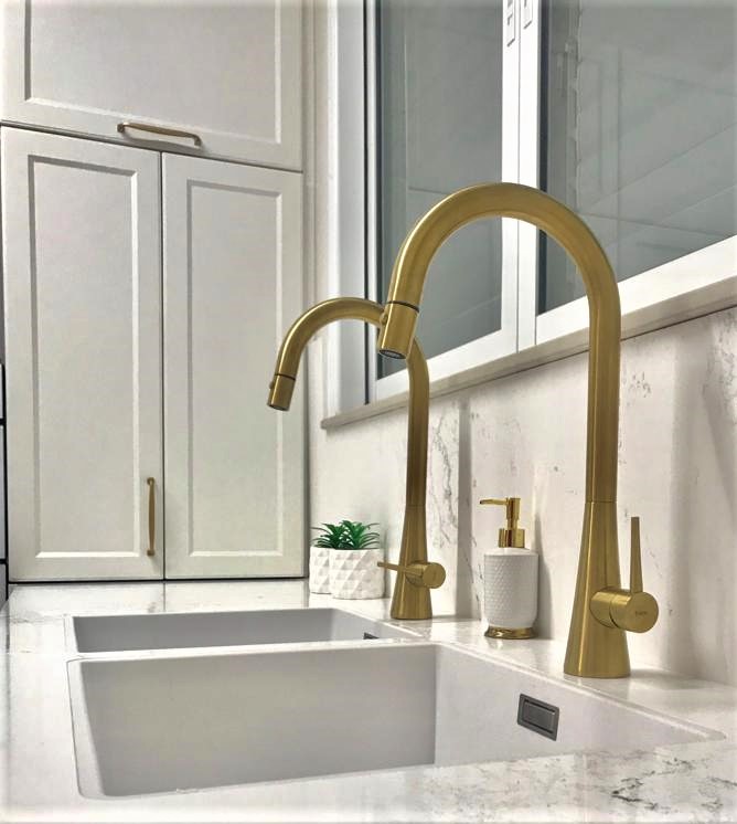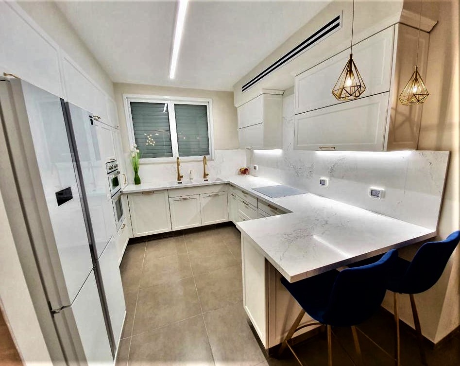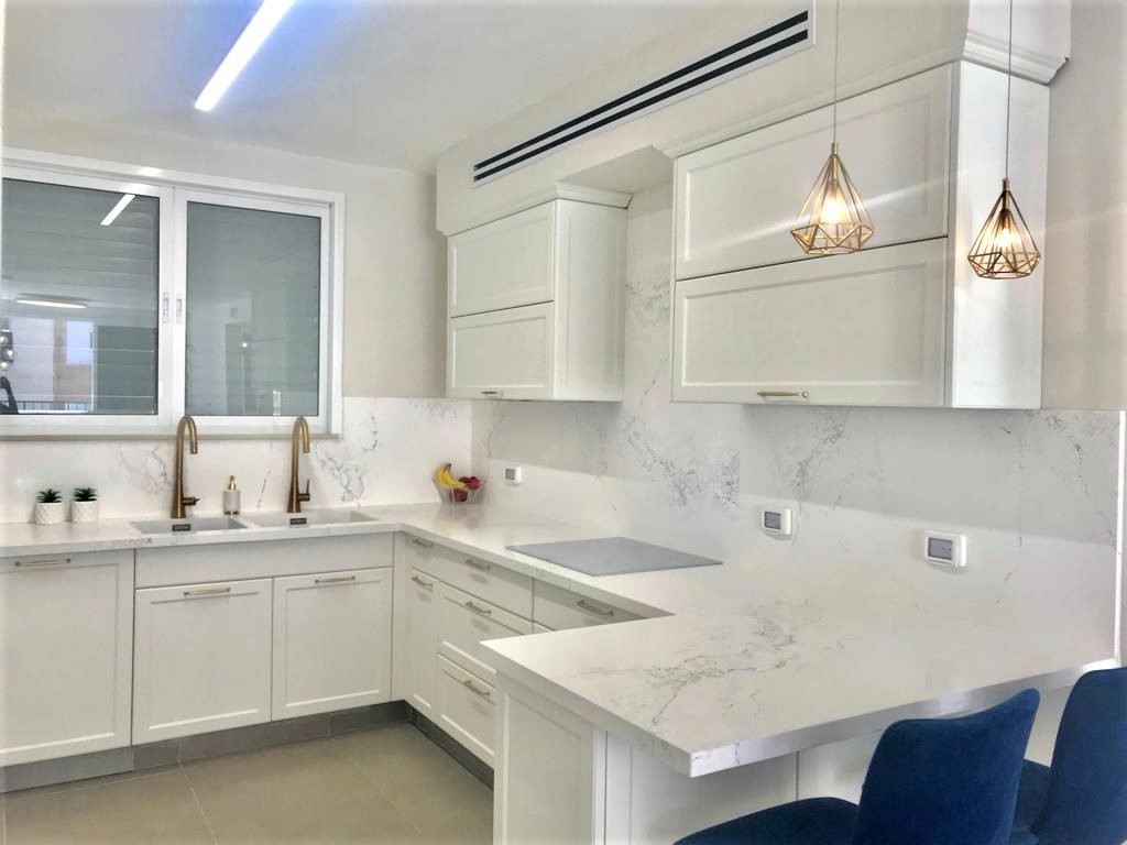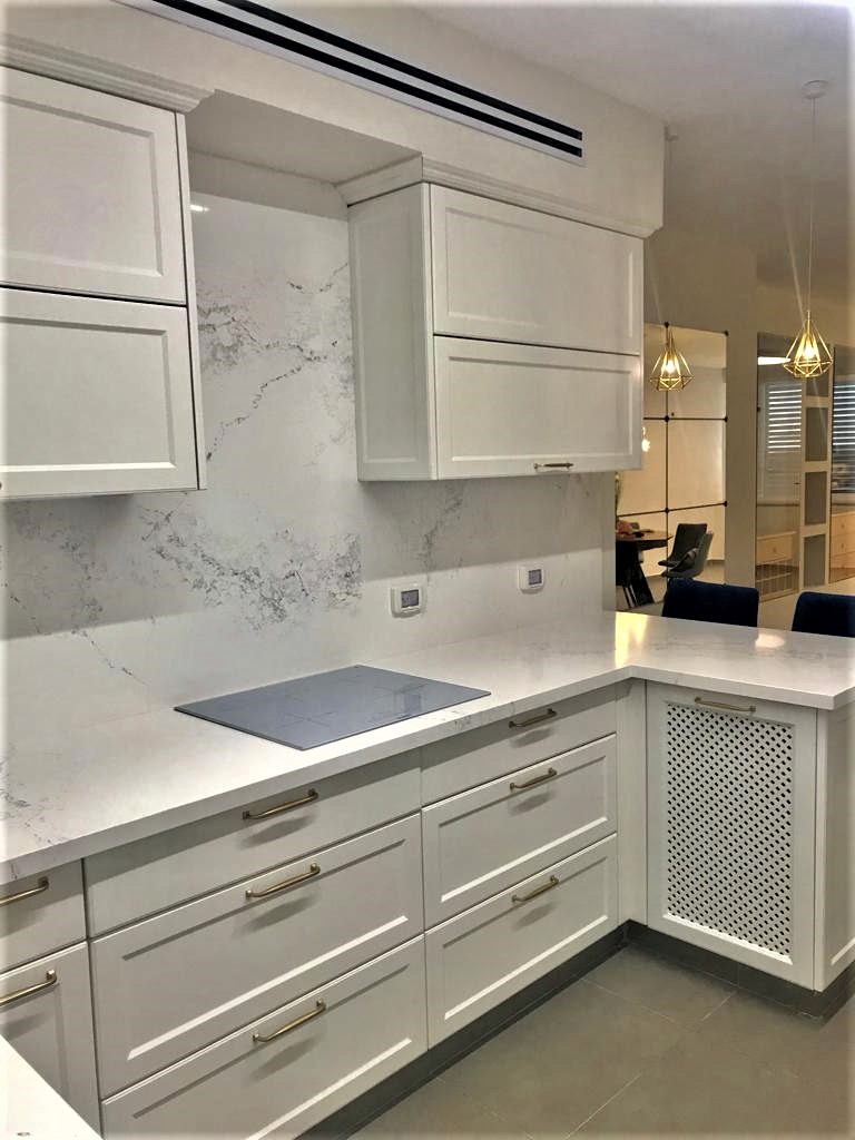 בגימור פולימר בגוון אופוויט, וידיות מוזהבות.